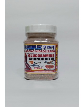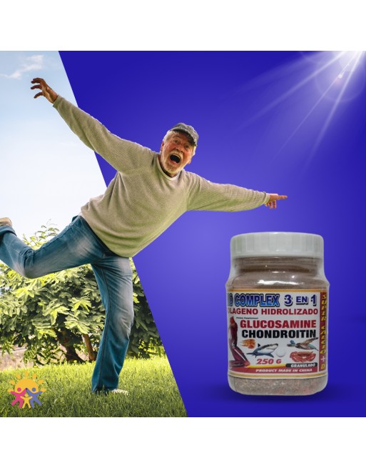 Calcicolageno complex hidrolizado complejo 3 en 1, contiene glucosamina, condroitina y colágeno. Presentación granulada; la glucosamina es una de las sustancias que tu cuerpo usa para formar. Actúa como un lubricante y regenerador del cartílago. Nivela el líquido sinovial. La Condroitina promueve el bienestar de las articulaciones dada su presencia en los cartílagos. Esta sustancia actúa en el control del desgaste de los cartílagos bloqueando la actividad de las enzimas que se encargan de degradar el colágeno. El colágeno hidrolizado: la principal función del colágeno es la de crear y mantener las estructuras de los tejidos que forman el organismo, incluida el componente esencial de la piel y afecta directamente a su elasticidad, hidratación y nutrición. Este increíble producto previene y regenera los cartílagos desgastados. Fortalece los ligamentos, suaviza los nervios evitando su endurecimiento. Rellena el desgaste de los huesos, evitando su adelgazamiento. Evita la pérdida de calcio. Mejora la artritis, artrosis, osteoporosis, osteopenia, descalcificación. A continuación te brindamos más información con respectos a sus componentes.
