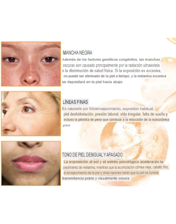 Maravilloso producto adecuado para personas que se quedan despiertas hasta tarde durante mucho tiempo, enfrentándose a la computadora, así como la radiación solar, estas personas tienen la piel seca, amarillenta y son propensas a las manchas, por lo cual esta esencia se hace necesaria para reparar la piel.