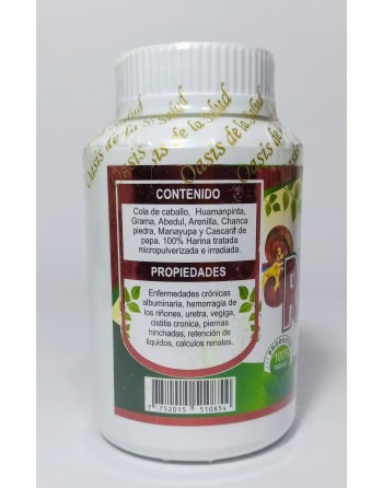 Maravilloso producto natural riñosan, ¿en qué te ayuda? A eliminar cálculos renales, enfermedades crónicas, hemorragias del riñón, albuminuria, uretra, inflamación de vejiga, cistitis crónica, piernas hinchadas, retención de líquidos, rejuvenecimiento y fortalecimiento de los riñones. Según la Medicina Tradicional China, (la cual tiene más de 4.500 años de existencia y tratando con espectacular éxitos multitud de enfermedades) es en el riñón donde reside la fuerza vital original del cuerpo humano: lo que los chinos llaman Jing, la raíz de la vida, en ellos también reside la base psicológica y emocional de cada persona. Esta energía esencial se almacena en los riñones, y es de dos clases: el Jing innato (heredado de nuestros padres) y Jing posterior o adquirido (todo lo sintetizado por el cuerpo) en funcionamiento, es la esencia adquirida a través de los alimentos. Por lo tanto, según la Medicina Tradicional China, el riñón es el receptáculo donde reside toda la carga congénita, además es el encargado de llevar el agua a los demás órganos del cuerpo, si los riñones no están lo suficientemente hidratados (de 6 a 8 vasos de agua diariamente) todos los órganos sufrirán, de hecho es una de las causas de insomnio. Este magnífico producto contiene: cola de caballo, huamanpinta, grama, abedul, arenilla, chanca piedra, manayupa y cáscara de papa.