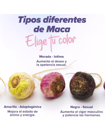 De acuerdo a los especialistas, se pueden encontrar en la naturaleza tres tipos diferentes de maca: negra, roja y amarilla. La maca negra era un tipo que usaba el ejército Inca para aumentar su energía y fuerza en las batallas y advertían que sus efectos son más rápidos y potentes que cualquier otro tipo. Algunas de sus características: aumento de la resistencia física y sexual: se la conoce como el "viagra andino", aumenta la fertilidad masculina y femenina, debido a que produce un aumento del número de espermatozoides y su movilidad. Es muy energizante y reduce los efectos del estrés y la fatiga. Promueve el buen humor. Mejora la memoria, la concentración y el aprendizaje más que cualquier otra maca. Contribuye al buen funcionamiento de los ovarios ya que ayuda a regular el ciclo menstrual. Por su parte, la maca roja ayuda a reducir el agrandamiento de la próstata, pero no afecta la fertilidad masculina.